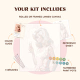 Raise a toast to sophistication and creativity with our "Champagne" paint by numbers kit. Featuring a stunning retro-inspired illustration of a poised woman holding a glass of champagne, this kit encapsulates timeless elegance and artistic charm. Perfect for adding a chic touch to your home or as a thoughtful gift for art and wine enthusiasts.