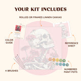 Dive into the intriguing world of art with the "Daisy Death" paint-by-numbers kit. This striking design juxtaposes the delicate beauty of daisies with the raw structure of a human skeleton, set against a bold background. Perfect for those who appreciate edgy and thought-provoking artwork, this kit invites you to create a captivating masterpiece that speaks to the cycles of life and death.