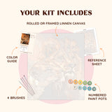 - 🖌️ Complete Kit: Includes everything you need—pre-numbered canvas, high-quality acrylic paints, and brushes.