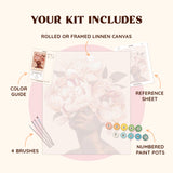 Step into a world of creativity with the "Pink Flora" paint by numbers kit. This stunning design features a beautiful woman adorned with a vibrant bloom of peonies, transforming the canvas into a serene and graceful work of art. The soft pink hues and delicate details invite you to experience the art of painting while celebrating the elegance of nature.