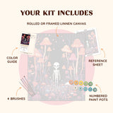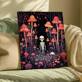 The Spooky Forest Paint by Numbers Canvas invites you into a mysterious and enchanting world. A skeleton stands in the midst of a whimsical forest filled with towering mushrooms and colorful flowers. The dark backdrop contrasts beautifully with the vibrant fungi, creating an otherworldly atmosphere. Perfect for those who love the spooky season and magical vibes!