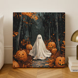 The Spooky Woods Paint by Numbers Canvas features a charming Halloween scene with a friendly ghost amidst glowing jack-o'-lanterns, set against the backdrop of a mysterious autumn forest. With a mix of eerie ambiance and playful pumpkins, this piece is the perfect addition to your Halloween decor or a fun, spooky project for the season!