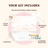 This minimalist and vibrant artwork features sailboats gliding across tranquil waters, framed by majestic mountains under a glowing sun. The The Gulf Paint by Numbers Canvas exudes calm and adventure, making it an ideal piece for nature lovers and travel enthusiasts.