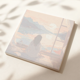 Experience tranquility with the Window View Paint by Numbers Canvas! This stunning design portrays a serene moment as a woman gazes out from her cozy spot by an open window, taking in the breathtaking view of a calm lake and majestic mountains during sunset. The soft, warm tones of peach, blue, and lavender create a peaceful and dreamy atmosphere, perfect for any home.