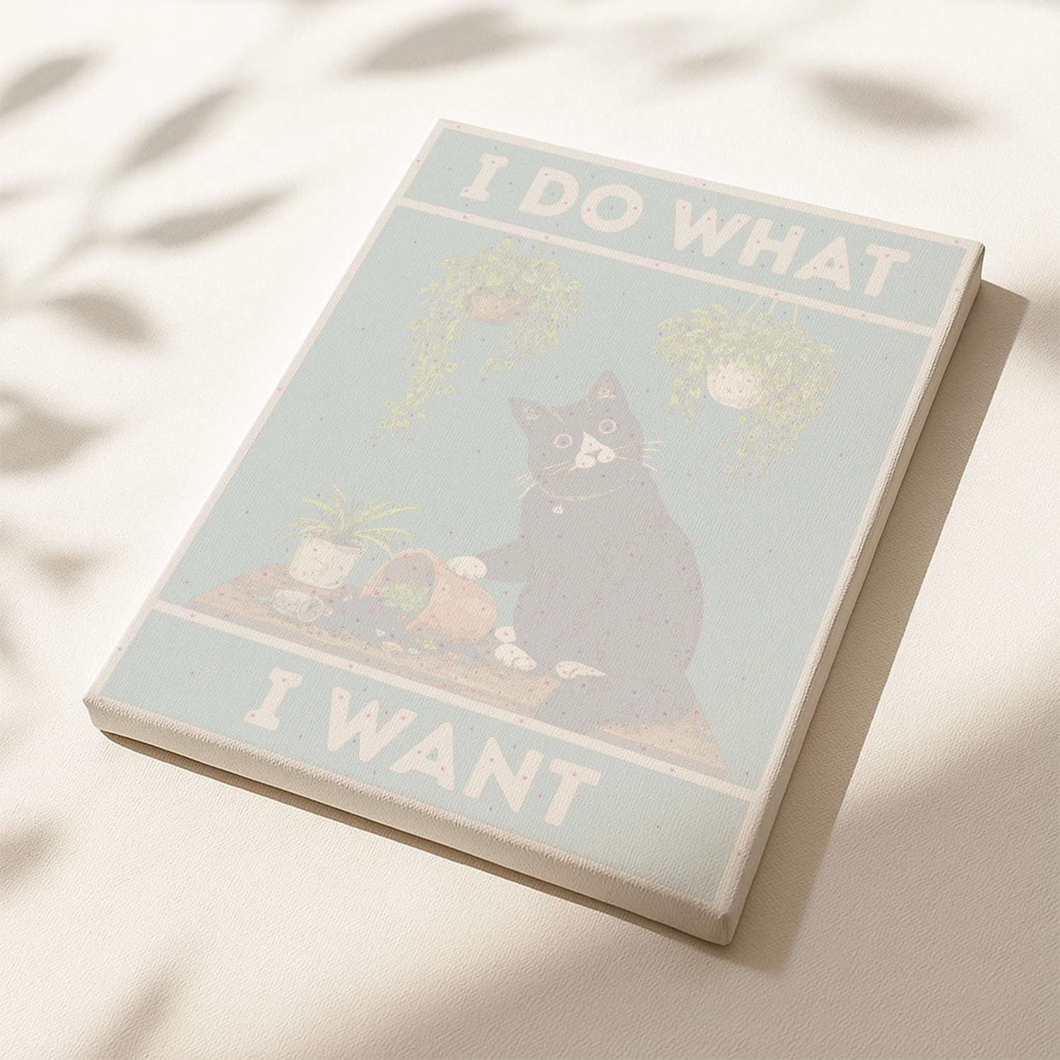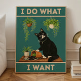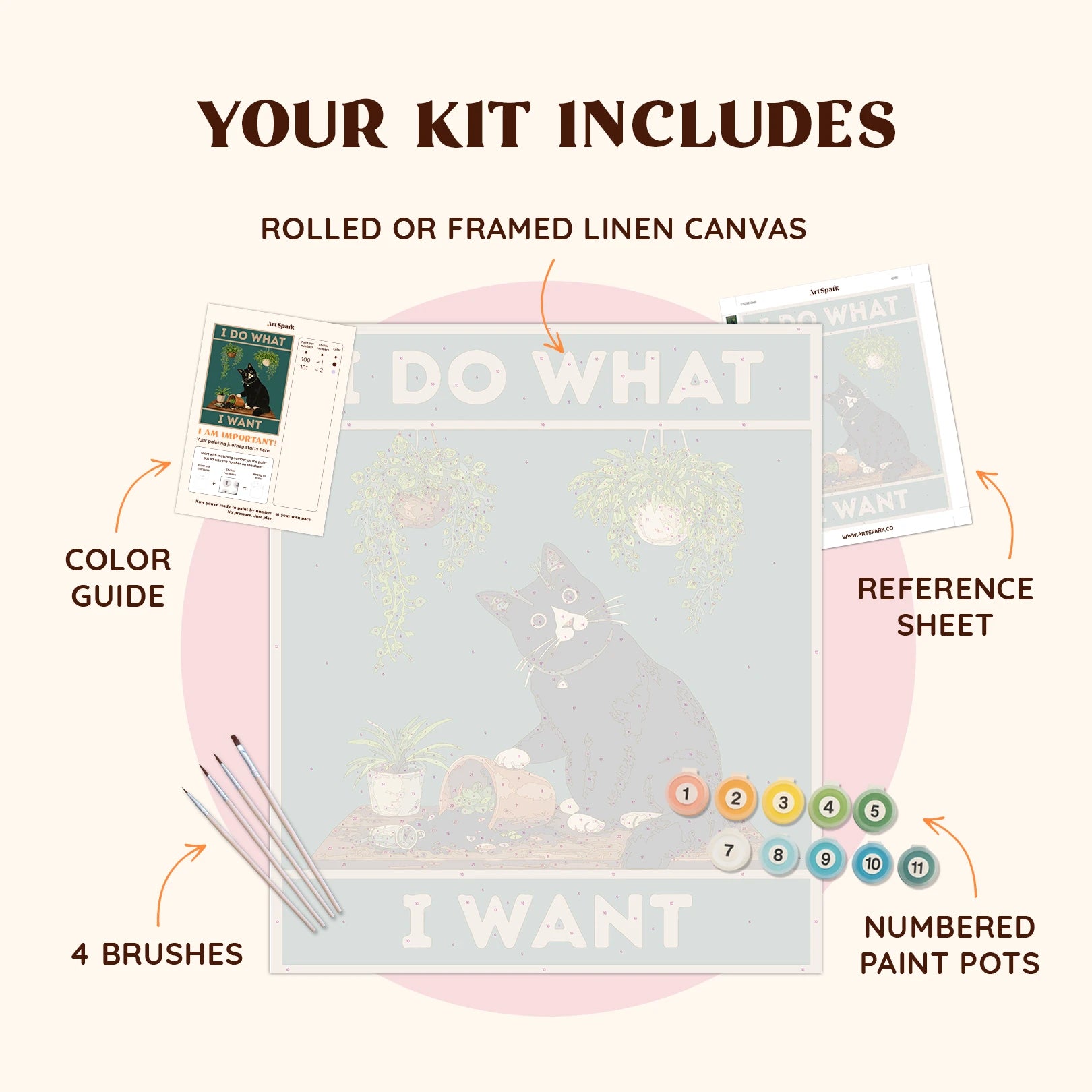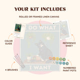 A charming and humorous paint by numbers artwork featuring a black and white cat caught mid-mischief after knocking over a plant pot, paired with the phrase “I Do What I Want.” The scene captures playful chaos with a modern, graphic style. Deep black fur contrasts with soft white markings, while earthy brown soil and warm terracotta tones add richness against a muted green background. This paint by numbers painting offers a relaxing, creative escape while turning a cheeky everyday moment into a lively paint by numbers artwork.