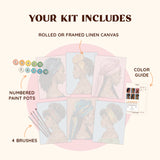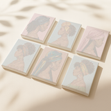 This artwork features six stylized profile portraits, each framed individually and unified through a modern, illustrative style. Earthy browns, muted pinks, teal blues, and warm ochres create a calm, cohesive palette, while patterned headwraps and textured hair add visual rhythm. The side-profile compositions feel intimate and reflective, with clean shapes and soft highlights guiding the eye. Designed as a paint by numbers experience, the artwork supports slow, focused creativity and a sense of balance. This paint by numbers piece is ideal for adults drawn to contemporary portrait art and a relaxing, expressive painting session.
