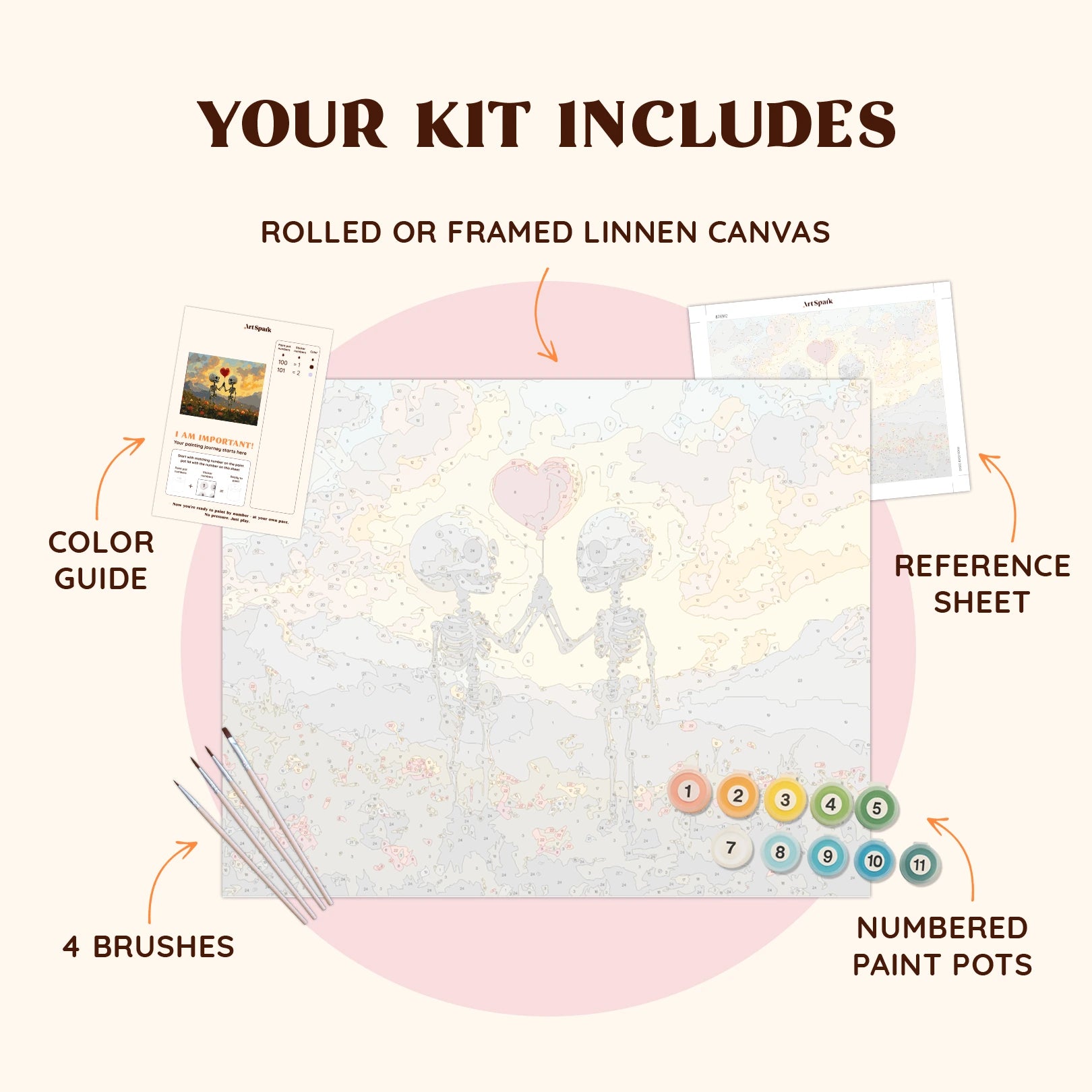 Celebrate a love that transcends time with our enchanting "Love Beyond Death" paint-by-numbers canvas. This captivating artwork depicts two skeletons holding a heart-shaped balloon against a stunning sunset backdrop, surrounded by vibrant wildflowers. Perfect for those who adore unique, symbolic, and heartfelt designs, this kit offers a creative way to express eternal love.
