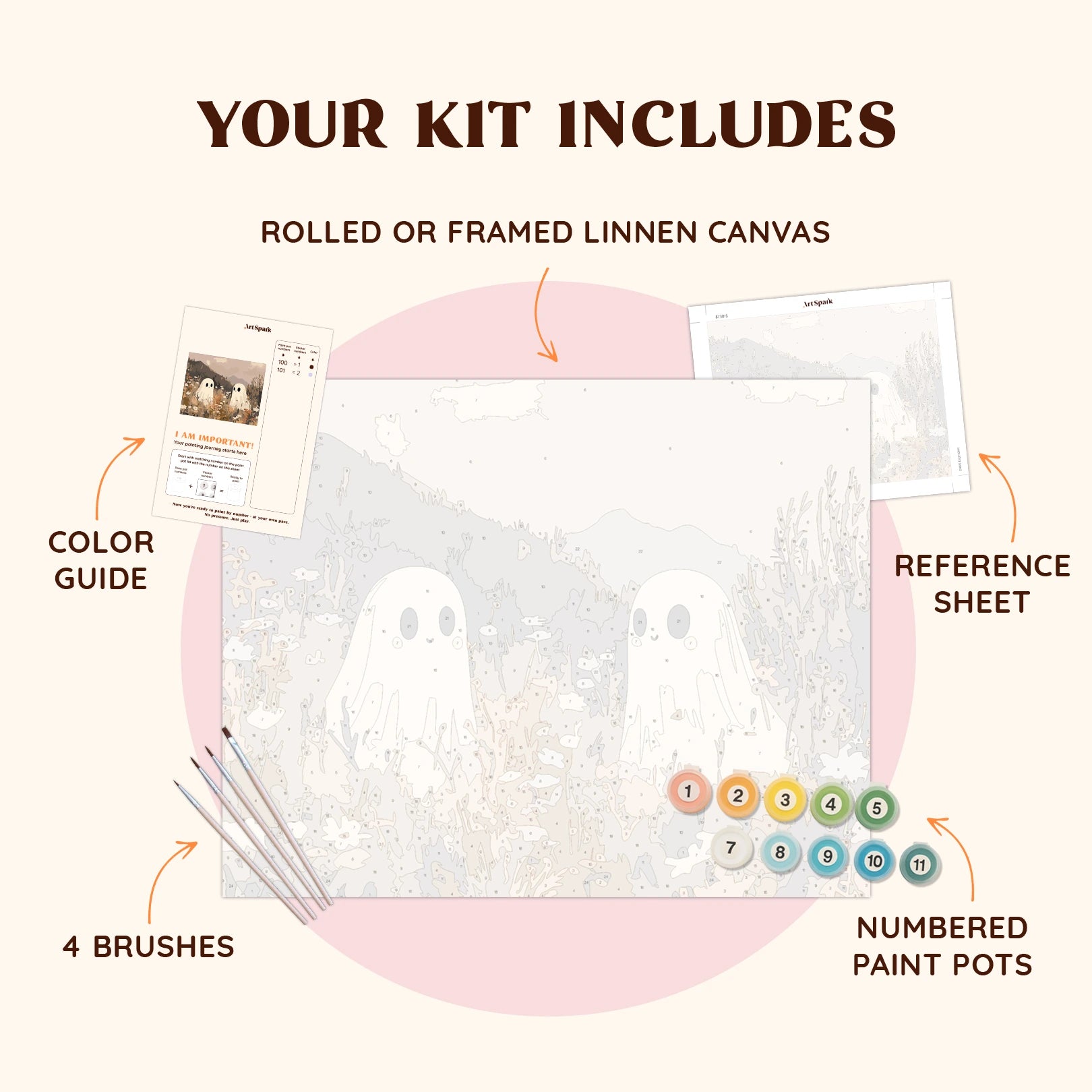 Discover the charm of the "Phantom Meadow" paint by numbers kit, where two adorable, friendly ghosts wander through a serene and magical meadow. This whimsical design combines soft earthy tones with a touch of playful mystery, making it a perfect addition to any home or creative space.
