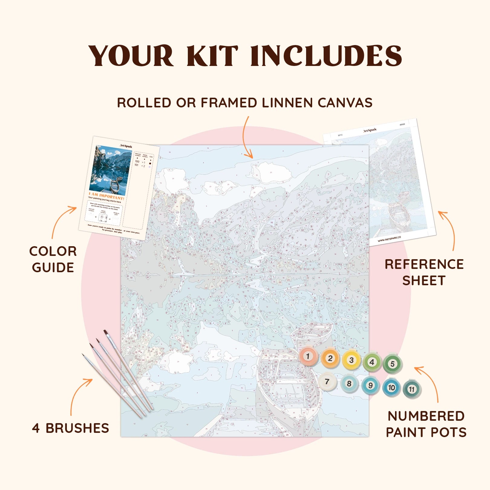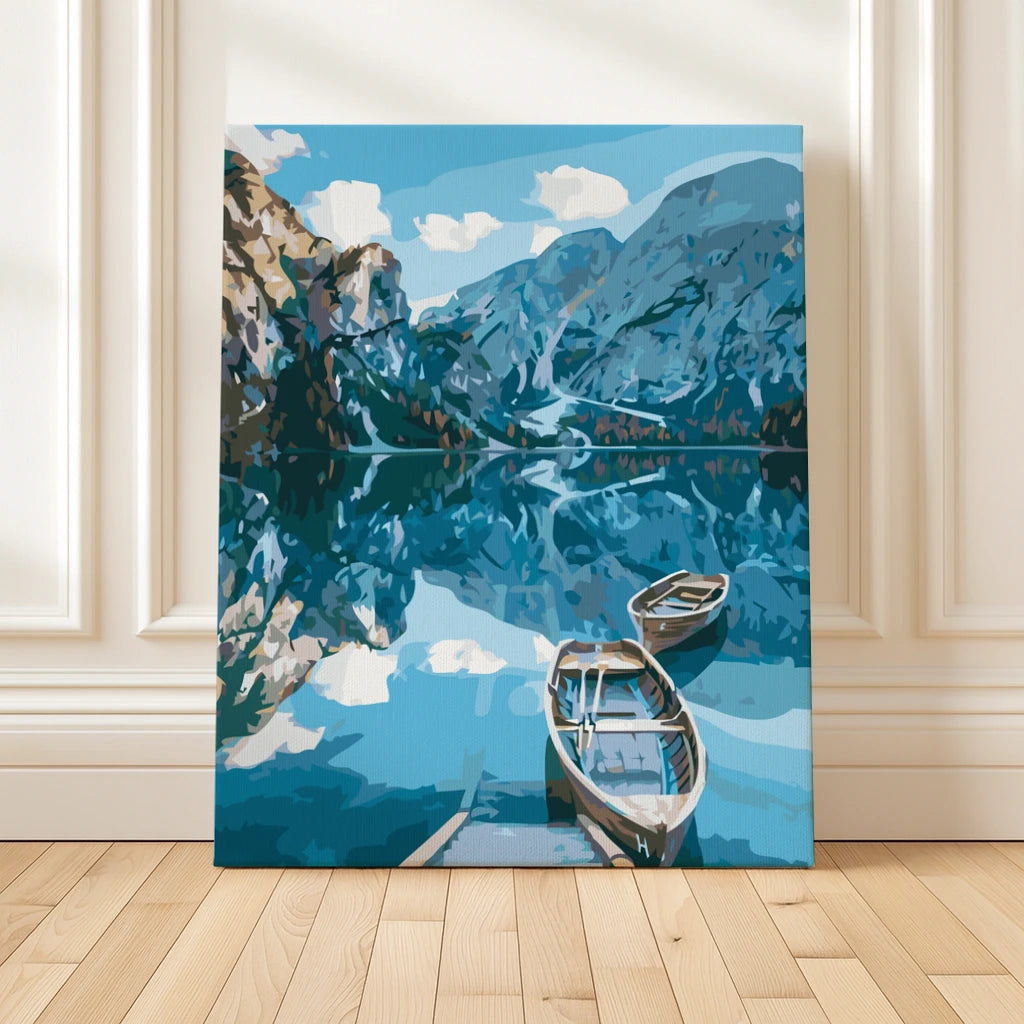 Capture the serene beauty of one of nature’s most breathtaking landscapes with our "Pragser Lake" paint by numbers kit. Inspired by the picturesque Lago di Braies (Pragser Lake) in Italy, this stunning design features calm waters reflecting towering mountains, with a peaceful wooden boat inviting you to drift into tranquility. The rich shades of blues, greens, and browns create a soothing color palette that evokes peace and harmony.