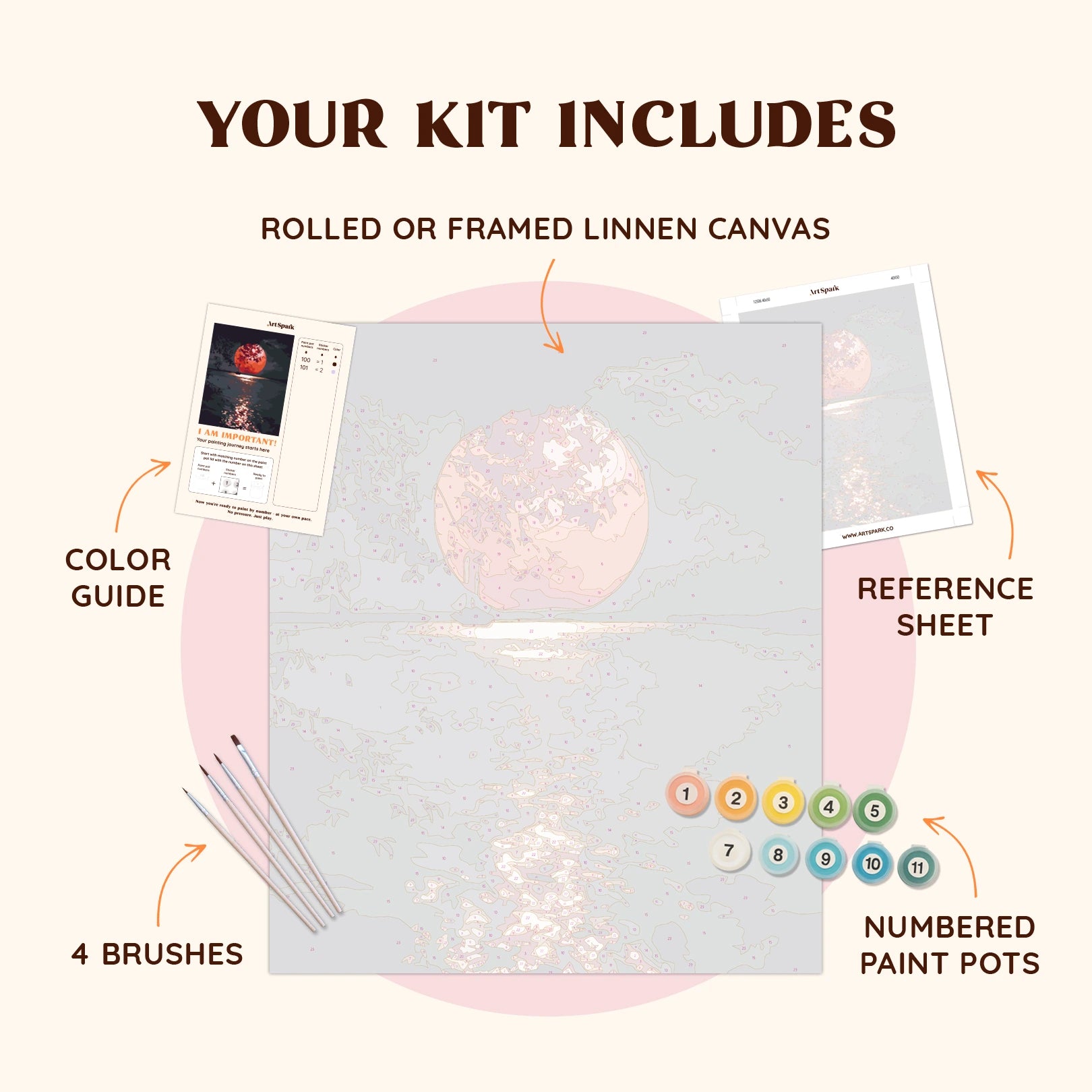 Embrace the magic of the Red Moon with this captivating paint-by-numbers kit. This stunning design captures the beauty of a fiery red moon hanging over a calm lake, reflecting the moonlight across the water. A boat gently floats in the distance, creating a serene yet mysterious atmosphere perfect for creating your own piece of tranquil art.