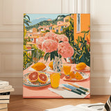 Bring the essence of a peaceful Mediterranean morning to life with this stunning paint-by-numbers canvas. Featuring a picturesque outdoor breakfast setting adorned with fresh citrus fruits, a bouquet of pink hydrangeas, and a backdrop of colorful hillside homes, this artwork radiates warmth and charm.