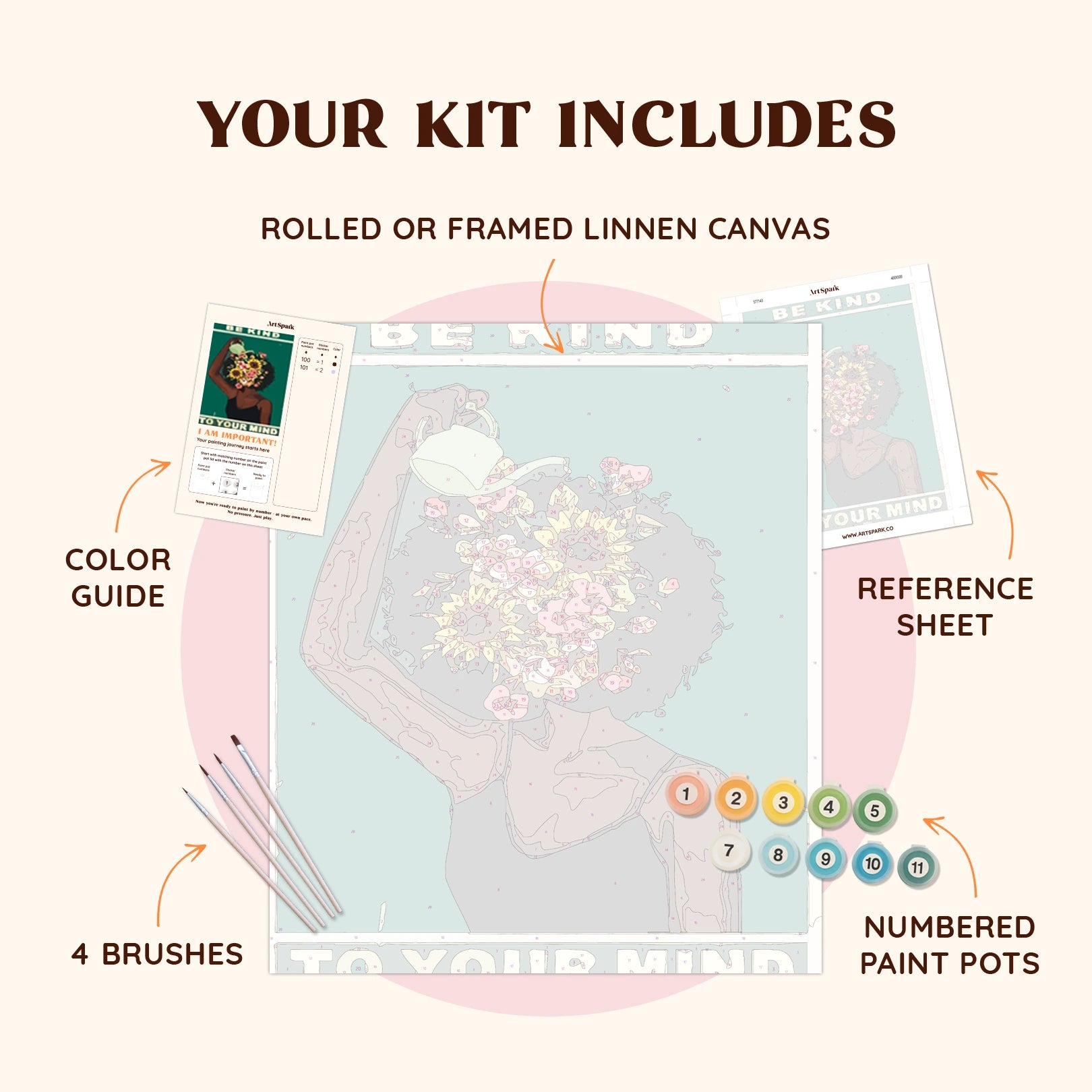 Discover the beauty of self-care and mindfulness with the "Be Kind" paint-by-numbers kit. This striking design features a figure watering their head of blooming flowers, symbolizing growth, kindness, and mental well-being. Perfect for anyone looking to combine relaxation with a meaningful artistic expression, this kit is a celebration of being kind to your mind and nurturing your inner garden.