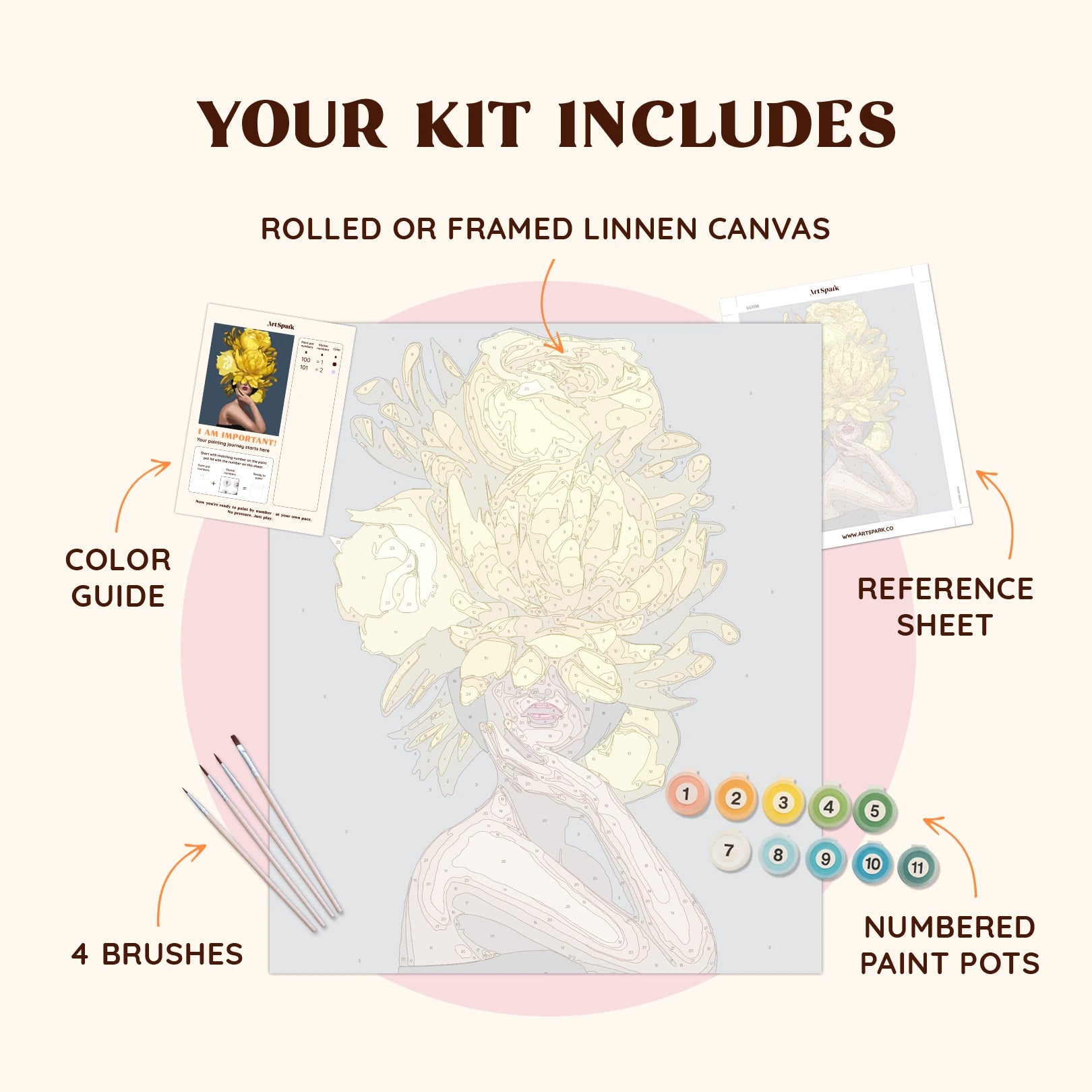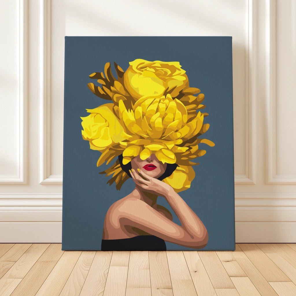 Transform your artistic journey with the breathtaking "Cassia" paint by numbers kit. Featuring a striking image of a woman adorned with a vibrant crown of golden flowers, this piece exudes elegance, confidence, and sophistication. The deep blue backdrop highlights the bold yellow hues, creating a masterpiece of contrast and allure.