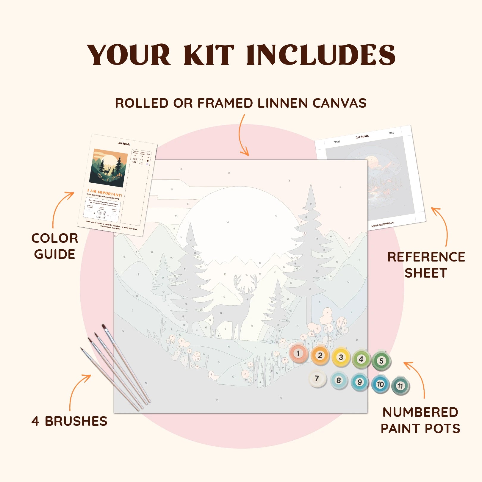 Step into the serene beauty of nature with the "Elk" paint-by-numbers kit. This enchanting design features a proud elk standing tall amidst a tranquil forest landscape, illuminated by a glowing moon. Perfect for wildlife lovers and nature enthusiasts, this kit captures the awe-inspiring essence of the wilderness.