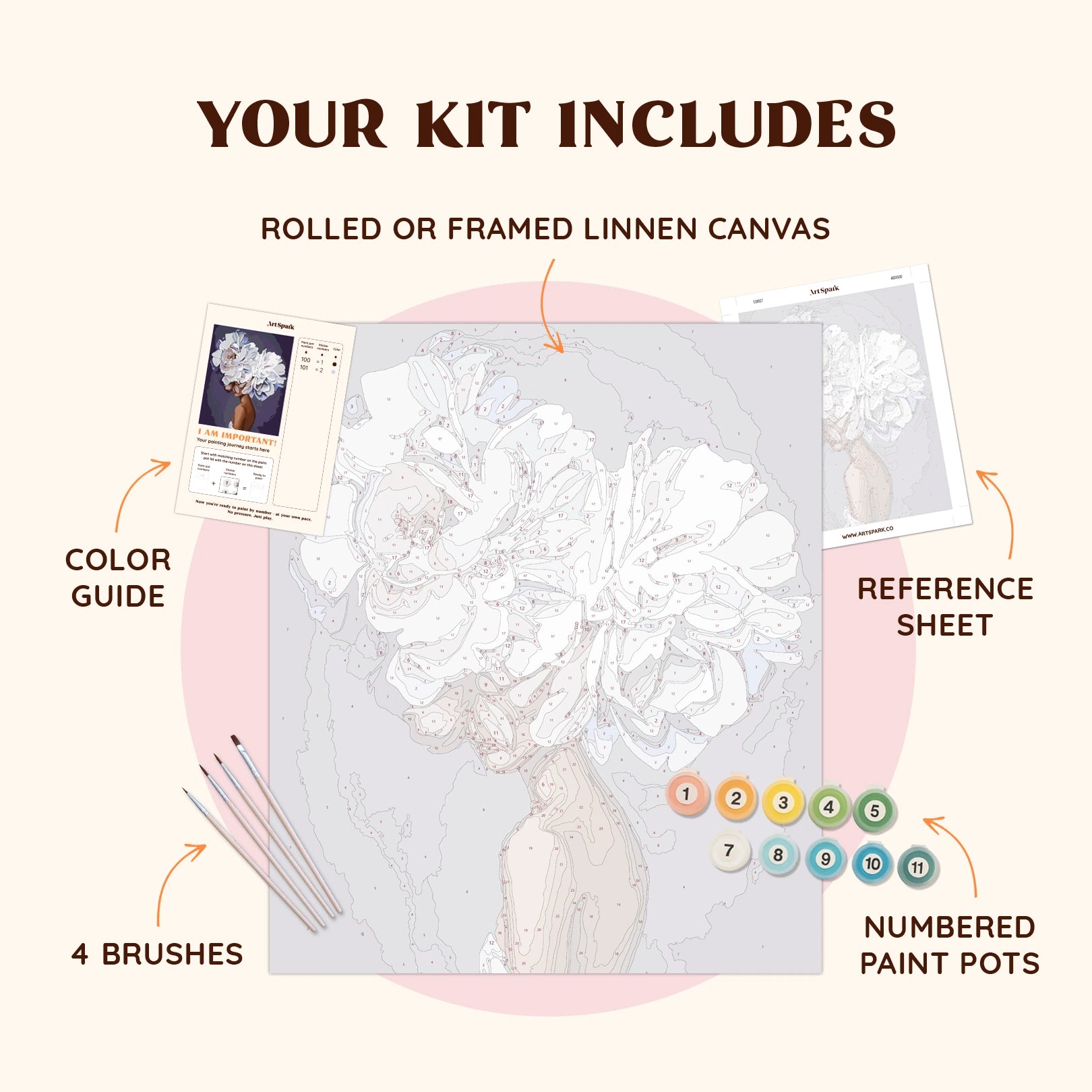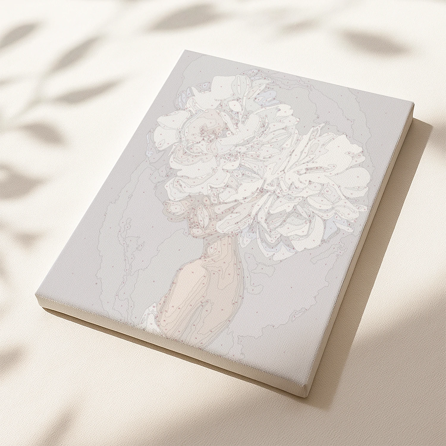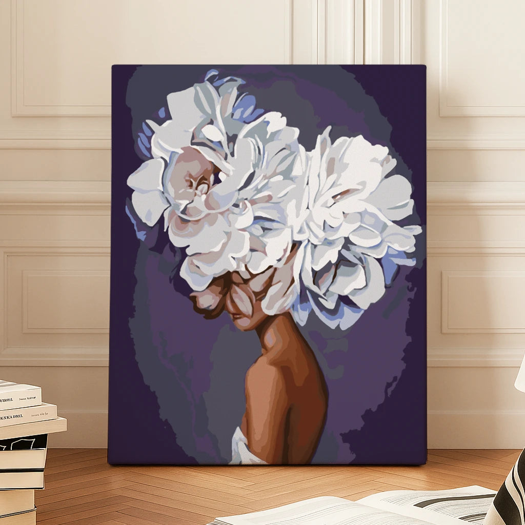 Celebrate the fusion of beauty and creativity with our "Lillian" paint-by-numbers canvas. This captivating design features a graceful silhouette adorned with a crown of oversized, blooming white flowers, exuding poise and sophistication. Perfect for adding a touch of modern elegance to your art collection or home decor.