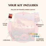 The Sunset Poppies Paint by Numbers Canvas is a vibrant celebration of nature, featuring radiant red poppies swaying in a glowing sunset sky. This breathtaking scene blends fiery oranges, purples, and reds, creating a warm and captivating artwork that will brighten any space.