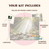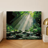 The Sunlight Paint by Numbers Canvas captures the serene beauty of a lush forest bathed in dappled sunlight streaming through the trees. With a gentle waterfall in the background and a tranquil river flowing over moss-covered rocks, this design is perfect for nature lovers and those seeking a peaceful escape.