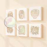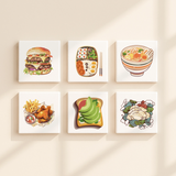 Unleash your creativity with the Flavors Around (Set of 6) paint by numbers kit. This unique collection features six stunning food-themed canvases including a juicy burger, detailed sushi bento, steaming bowl of ramen, crispy fried chicken with fries, stylish avocado toast, and delicate dumplings. Perfect for adding a playful, mouth-watering touch to your kitchen or dining room.