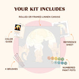 Celebrate the beauty of companionship with the "Friendship" paint-by-numbers canvas. This enchanting design features two cats gazing at a glowing full moon, set against a serene cityscape. Perfect for cat lovers and art enthusiasts, this kit brings a sense of warmth and connection to your creative space.