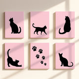 This paint by numbers set features a clean, minimalist collection of black cat silhouettes set against soft pink backgrounds. Each design captures a different pose—from sitting and walking to stretching and playful movement—creating a calm, modern aesthetic that feels both elegant and cozy.