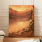 A skeleton leans back against a tree beside a calm mountain lake, watching the sunset reflect across warm orange and golden water. Layers of soft brown mountains and dark green trees frame the scene, creating a peaceful, cozy mood that feels both quiet and reflective. This paint by numbers artwork captures the gentle glow of evening light with warm earth tones and simple, modern shapes. As a paint by numbers painting, it offers a soothing creative escape, allowing you to slowly build the tranquil landscape and bring this serene outdoor moment to life.