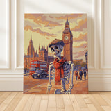 A skeleton dressed in a classic cap and red scarf strolls through London, with Big Ben rising behind and bright red buses moving along the street. Warm golden skies blend with soft blue and beige tones, creating a lively yet charming city atmosphere. This travel-inspired paint by numbers artwork captures the energy of London with clean lines, bold landmarks, and balanced color blocks. As a paint by numbers painting, it offers a relaxing, creative way to recreate this iconic scene, slowly building the rich architectural details and timeless urban character.