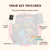 Step into a bold and psychedelic world with the "Fungi Dreams" paint-by-numbers canvas. This striking design blends the elegance of a woman’s portrait with a surreal crown of neon mushrooms, creating an artistic masterpiece that’s both unique and mesmerizing. Perfect for lovers of modern art and imaginative designs, this kit offers a fun and creative escape.