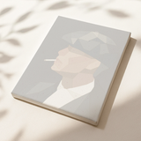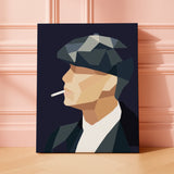 This striking paint by numbers artwork captures the side profile of a man in a flat cap with a cigarette, set against a deep, dark background. Rendered in bold, geometric shapes, the portrait uses layered tones of navy, gray, beige, and black to create a faceted, modern look. The sharp angles and simplified forms enhance the moody, intense atmosphere while keeping the composition clean and graphic. This paint by numbers painting offers a focused, immersive creative experience, allowing you to recreate a powerful vintage-inspired portrait with strong contrast and understated color.