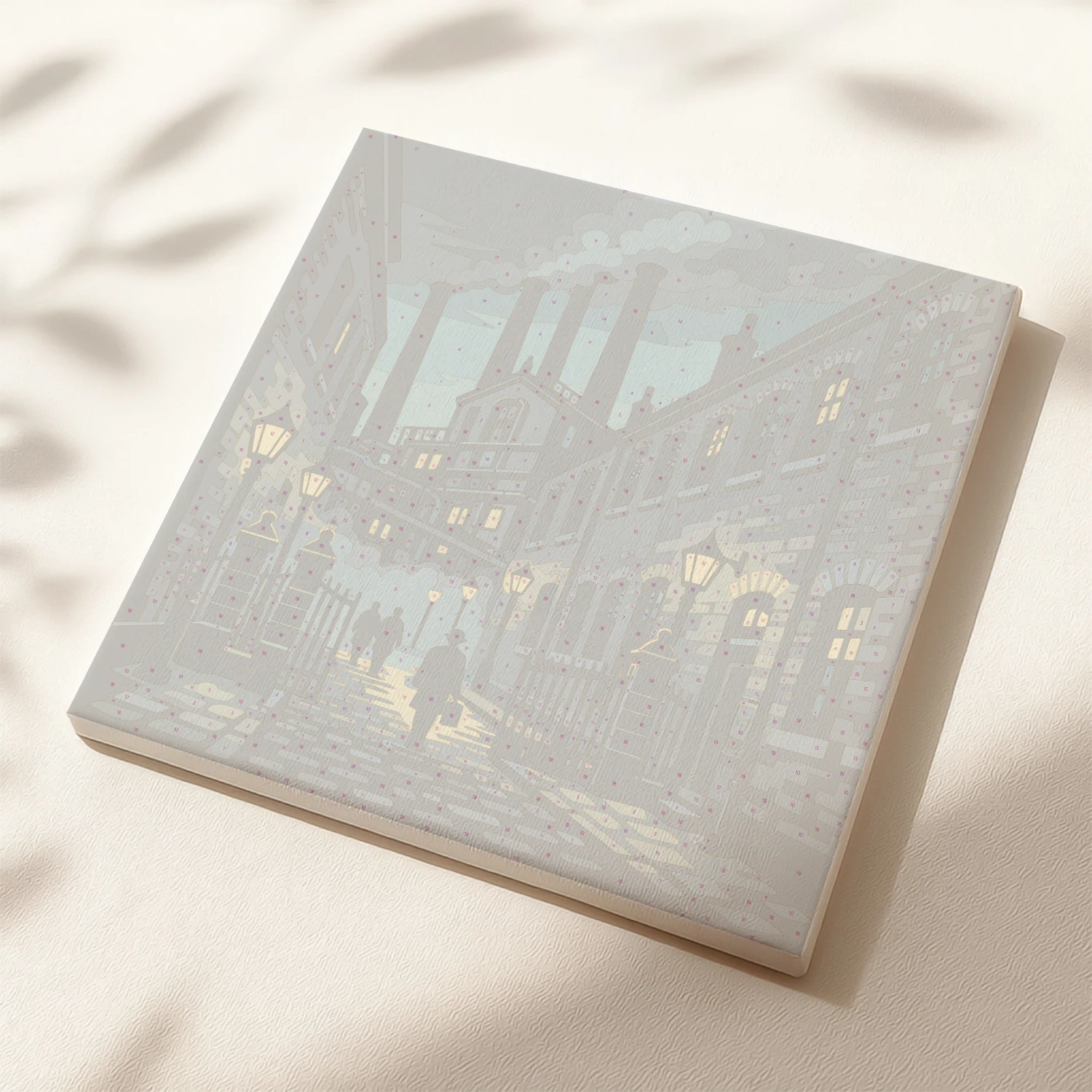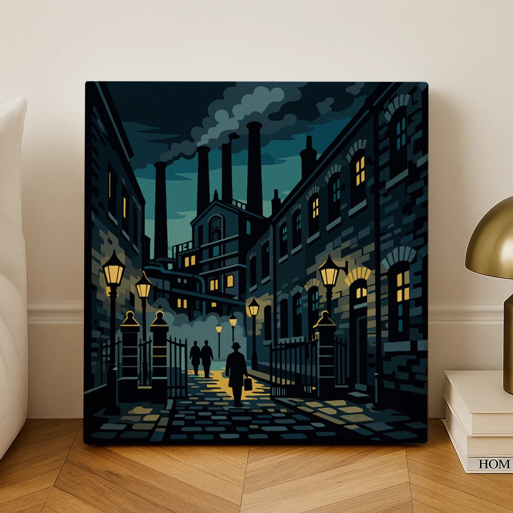 Deep blue and muted green tones set a dark, atmospheric mood in this striking paint by numbers artwork inspired by Birmingham city. The scene captures an industrial street at night, with tall factory smokestacks rising into a smoky sky and warm yellow streetlamps casting light across cobblestone paths. Silhouetted figures walk between iron gates and brick buildings, adding depth and quiet movement to the composition. Strong contrast between shadow and glow creates a cinematic effect. This paint by numbers painting offers an immersive, calming creative experience with bold urban character.