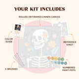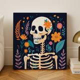 Bring together the mystique of the night and the vibrancy of blooming flowers with the "Midnight Florals" paint-by-numbers canvas. This unique artwork features a skeletal figure adorned with colorful flowers, creating a captivating contrast between life and mortality, making it perfect for art lovers with a bold sense of creativity.