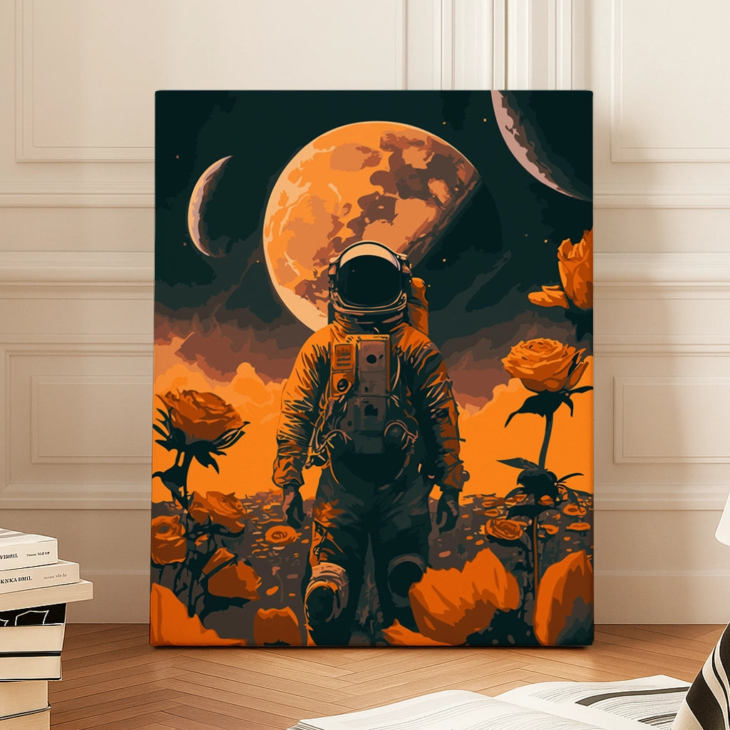 Step into a surreal cosmic journey with the "New Discovery" paint by numbers kit. This striking design features an astronaut exploring a mysterious alien landscape adorned with glowing flowers under the light of celestial planets. Ignite your imagination and creativity as you bring this otherworldly scene to life.