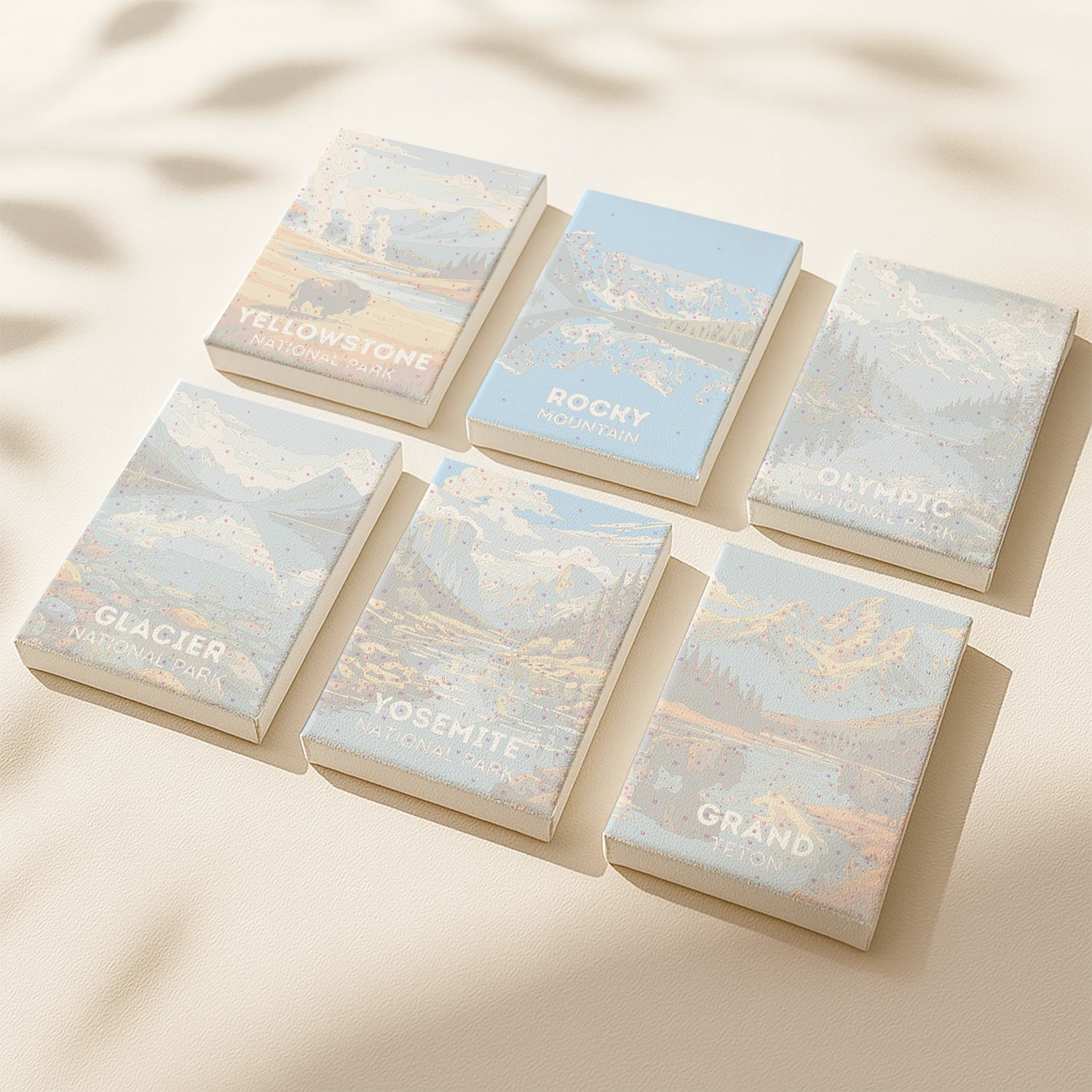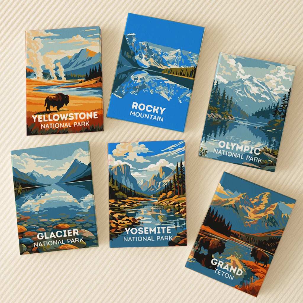 This paint by numbers artwork features a set of national parks northern road trip scenes, bringing together iconic mountain landscapes in one cohesive collection. Cool shades of blue and white highlight snowy peaks and reflective lakes, while deep green forests and soft earthy tones add natural contrast throughout each piece. The arrangement captures a sense of calm exploration, with each scene flowing into the next as part of a unified journey. Designed in a modern, graphic style, this paint by numbers painting offers a relaxing and immersive creative experience inspired by scenic northern wilderness.