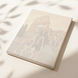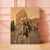 A lone skeleton with a travel backpack stands before the towering Colosseum, captured in warm beige and soft brown tones under a muted golden sky. The historic arches rise behind the figure, creating a nostalgic yet adventurous mood that blends ancient architecture with quirky character detail. This stylized paint by numbers artwork uses clean lines and earthy colors to evoke a timeless travel moment. As a paint by numbers painting, it offers a calming, focused creative experience while bringing this iconic landmark scene to life through layered stone textures and subtle sunset light.