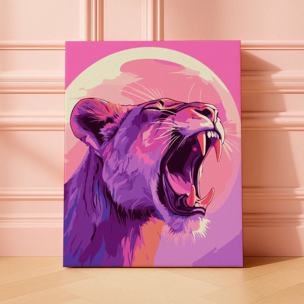 Unleash your fierce creativity with the Wild Queen Paint by Numbers Canvas! This bold and striking design features a majestic lioness mid-roar, rendered in vibrant shades of pink and purple. Set against a soft pastel moonlit background, this artwork radiates strength, power, and elegance, making it the perfect statement piece for any space.