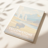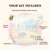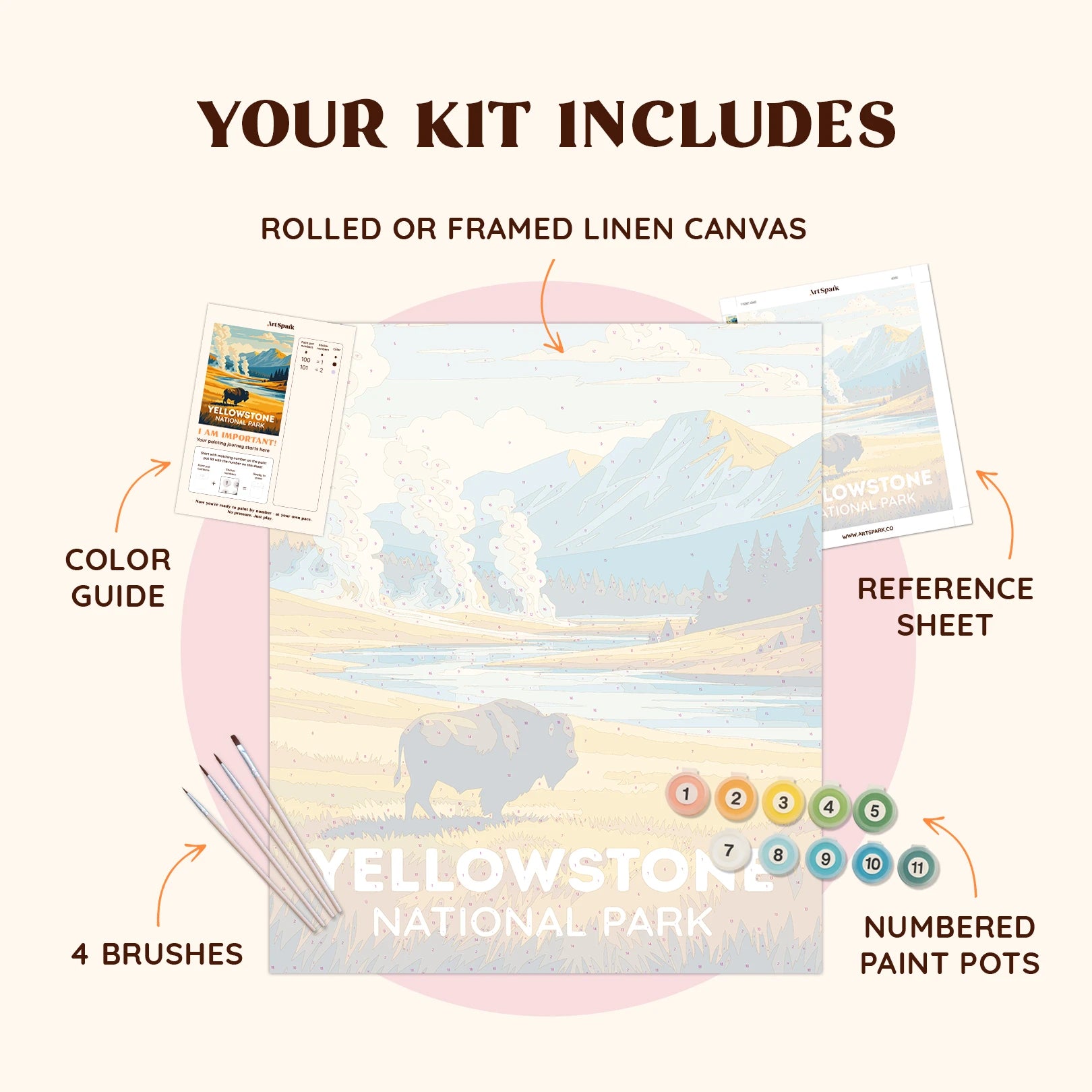 This paint by numbers artwork features a Yellowstone National Park illustration with a lone bison standing near a winding river in a geothermal valley. Warm golden tones of yellow and orange spread across open grasslands, while soft blue water and distant mountains create a calm, balanced contrast. Rising steam from geysers adds movement and atmosphere to the scene. Designed in a bold, modern style, this paint by numbers painting offers a relaxing and immersive creative experience inspired by iconic wildlife and landscapes.
